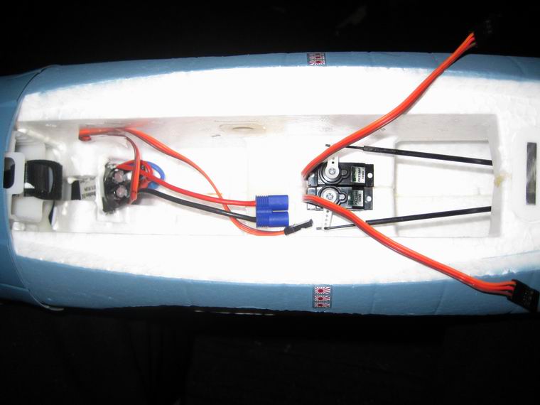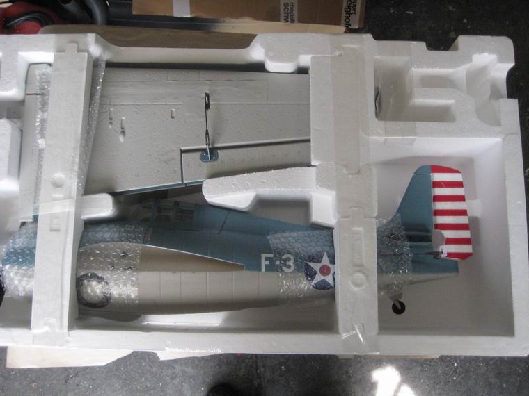 verpackt in einem Styrokarton geliefert. Der Rumpf ist mit allen Servos, dem Motor und dem Motor
