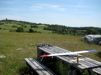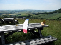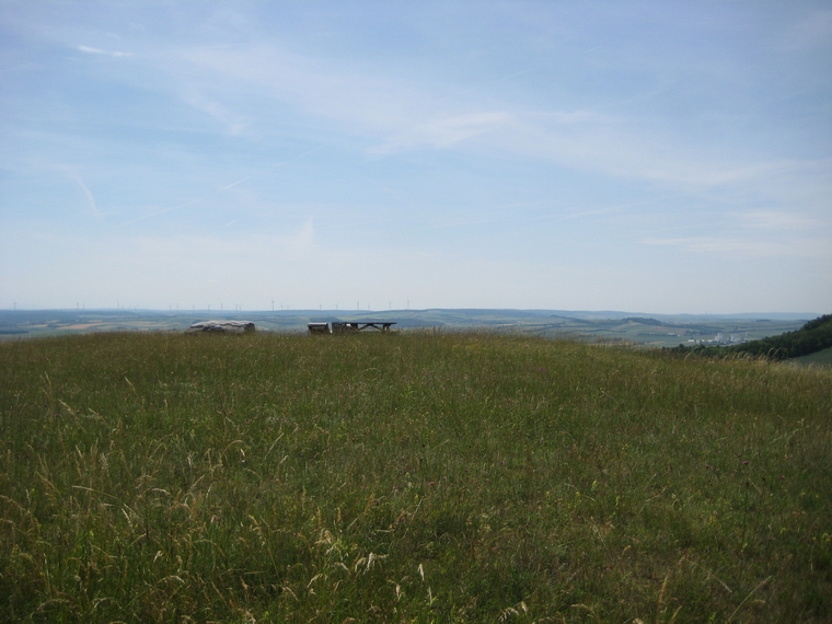 höchsten Punkt steht ein Holztisch mit Bänken und zwei